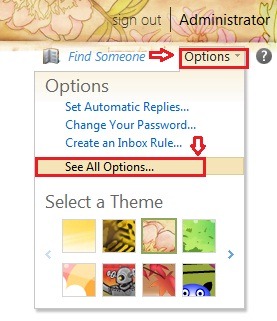 6. Για να δημιουργήσουμε Rules, θα πρέπει να μεταβούμε στην ECP (Exchange Control Panel). Επιλέγουμε επάνω δεξιά Options και επιλέγουμε See all options.