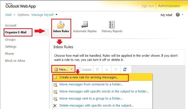7. Στο επόμενο βήμα, επιλέγουμε Organize EMail και στην δεξιά πλευρά του παραθύρου Inbox rules και έπειτα NewàCreate a new rule for arriving messages.