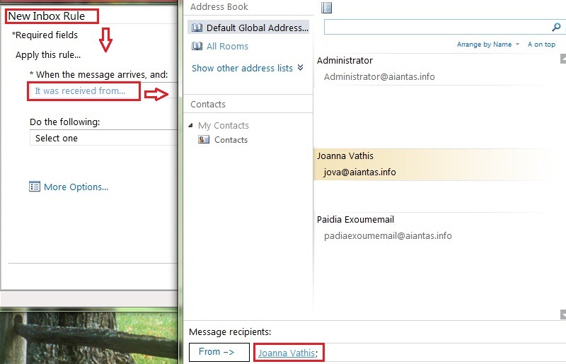 9. Στο παράθυρο διαλόγου New Inbox Rule, θα επιλέξουμε στο When the message arrives, and: την επιλογή It was received from…. και επιλέγουμε από τα Contacts μας το email του αποστολέα μας.