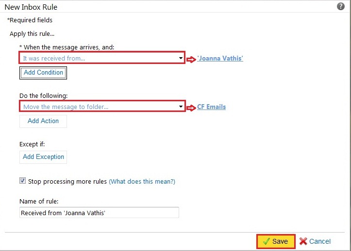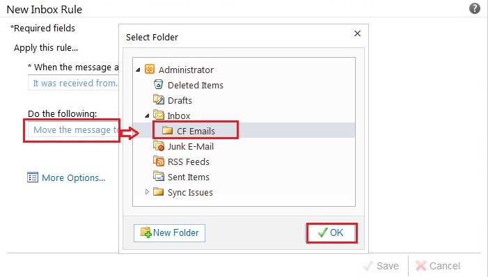 8. Θα δούμε την δημιουργία ενός απλού Rule, που όταν λαμβάνουμε μηνύματα από έναν συγκεκριμένο χρήστη , θα μεταφέρονται σε συγκεκριμένο φάκελο που τον έχουμε ονομάσει «CF Emails».