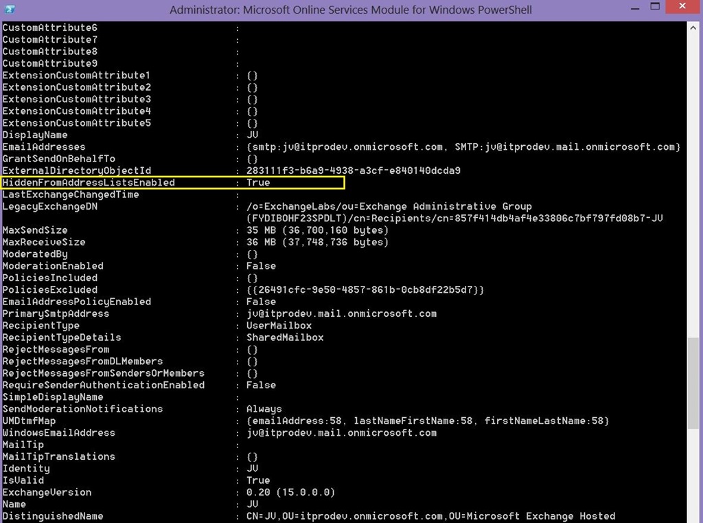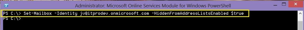 Set-Mailbox -Identity jv@itprodev.onmicrosoft.com -HiddenFromAddressListsEnabled $true