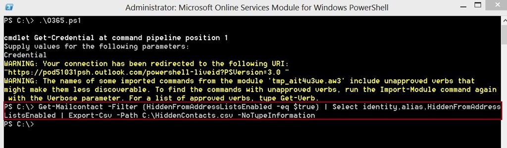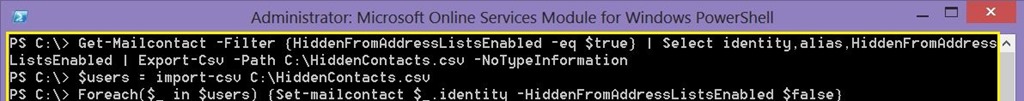 3. Unhide the contacts from C:\HiddenContacts.csv file by running the following cmdlet: