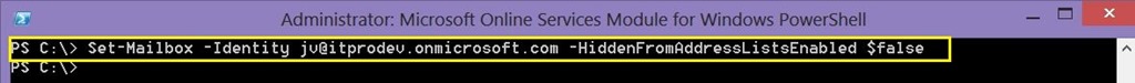 Set-Mailbox -Identity jv@itprodev.onmicrosoft.com -HiddenFromAddressListsEnabled $false
