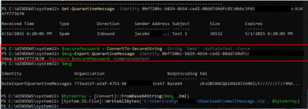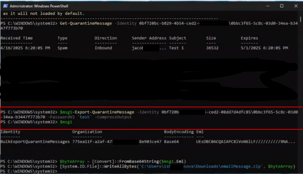 • The first command exports the quarantined message and attachments to the variable $f. The message and attachments are stored in the Eml property (the $f.eml value) as Base64 (based on the $f.BodyEncoding value).