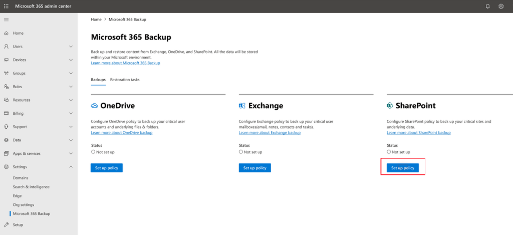 Microsoft 365 Backup is currently in preview and will begin rolling out to organizations in early 2024. You can set up billing for the product as described in Set up Microsoft 365 Backup. Once Microsoft 365 Backup has been deployed and is available for use in your tenant, you’ll see it in the Microsoft 365 admin center page under Settings.