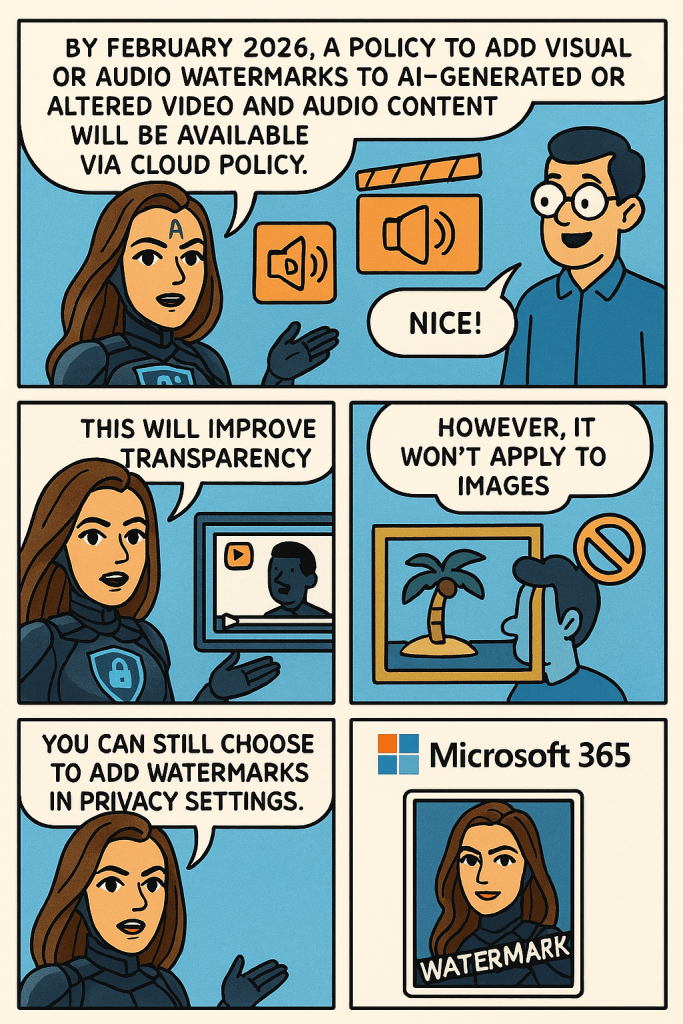 Microsoft 365 will offer a policy to add visual or audio watermarks to AI-generated or altered video and audio content, available via Cloud Policy by February 2026. This enhances transparency but does not apply to images, which users can watermark through privacy settings separately.